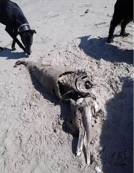 The five-foot long carcass found on Rhossili Beach, Swansea has a long head, giant jawline and slender tail.